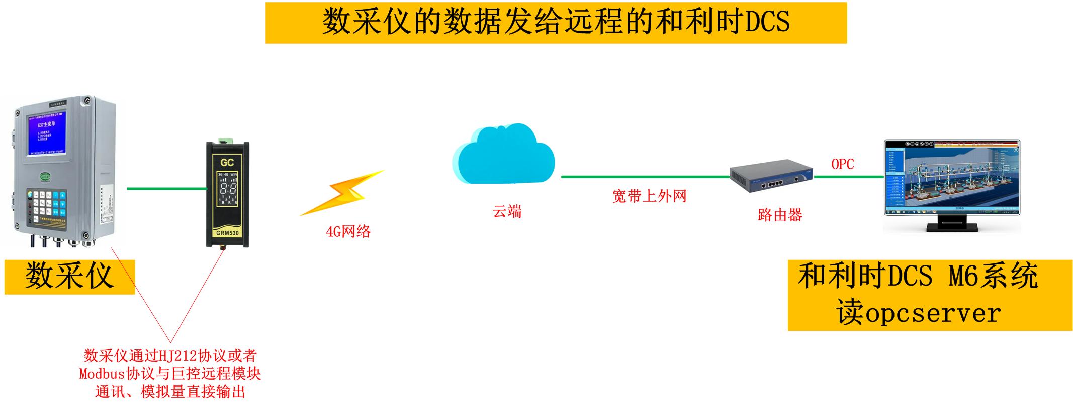 把數(shù)采儀的數(shù)據(jù)發(fā)給和利時DCS M6系統(tǒng),數(shù)采儀通過485口走modbus rtu或者環(huán)保HJ212協(xié)議直接到巨控GRM230, 或者從數(shù)采儀的模擬量輸出口直接接到GRM230的本體IO,通過4G發(fā)送到監(jiān)控中心,和利時DCS這臺電腦需要連上外網(wǎng),安裝巨控GRMOPCSERVER即可接收。不需要固定IP