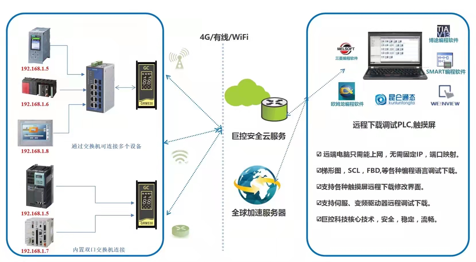 用巨控的遠(yuǎn)程網(wǎng)關(guān),巨控在海外部署多個(gè)加速云服務(wù)器,極大減少網(wǎng)絡(luò)延遲,實(shí)現(xiàn)PLC國(guó)外遠(yuǎn)程調(diào)試