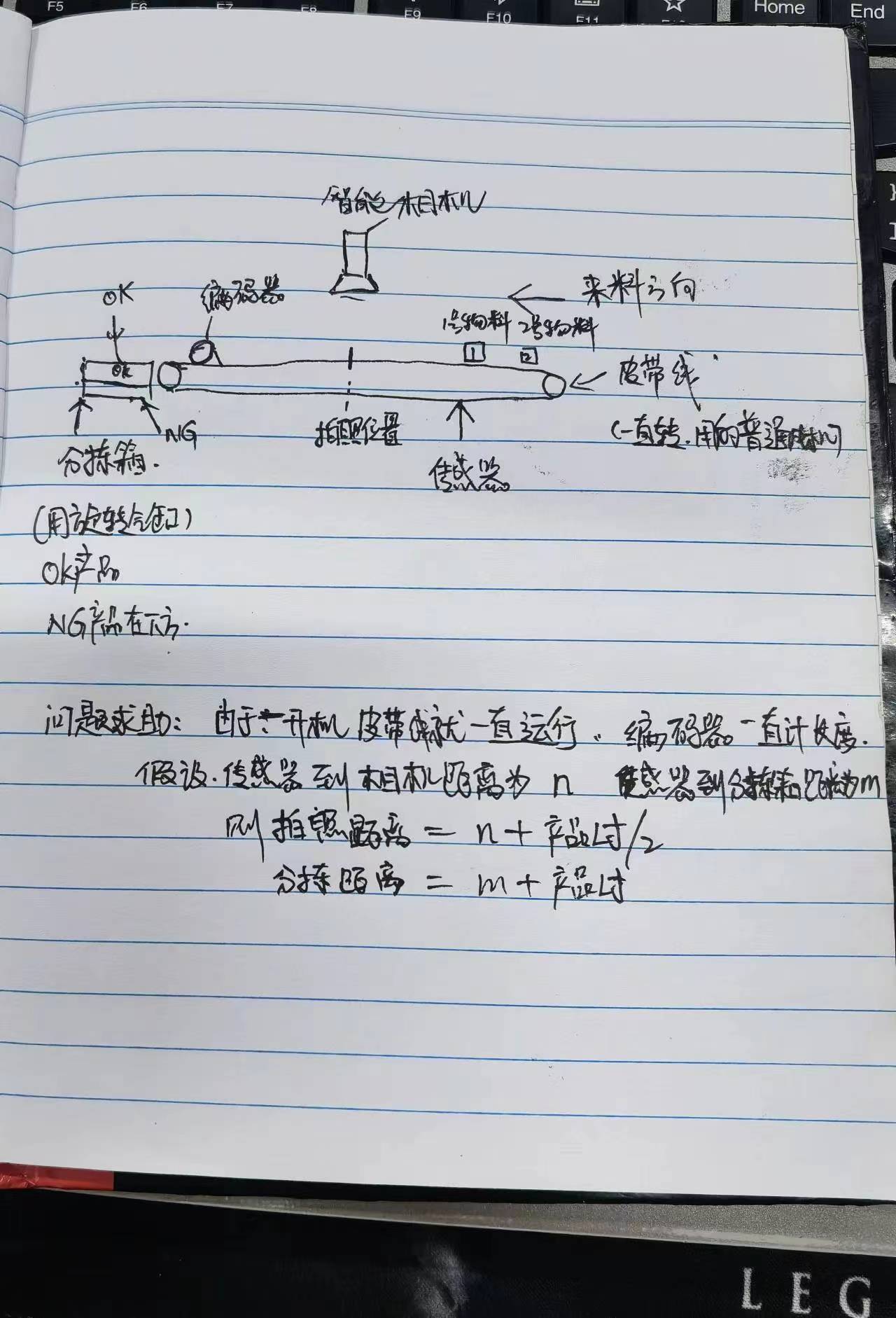 編碼器作用感覺不大,在畫編碼器的地方放個(gè)光電開關(guān)感應(yīng)物品出皮帶,或者在NG工位進(jìn)口裝一個(gè)比你編碼器簡單多了。皮帶速度要算好,大概多少時(shí)間物品能進(jìn)到位,下降沿觸發(fā)。