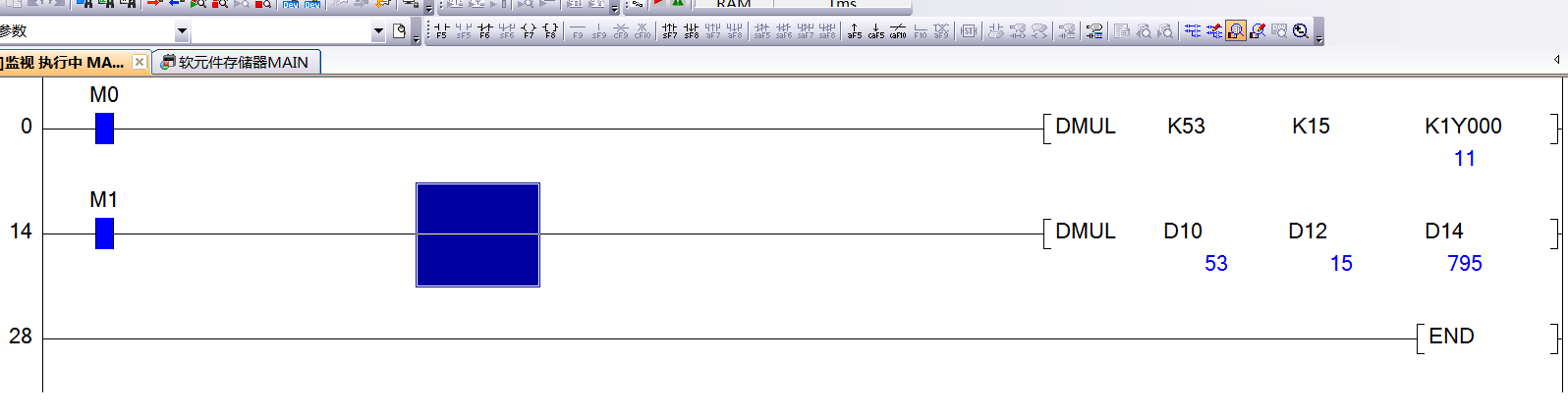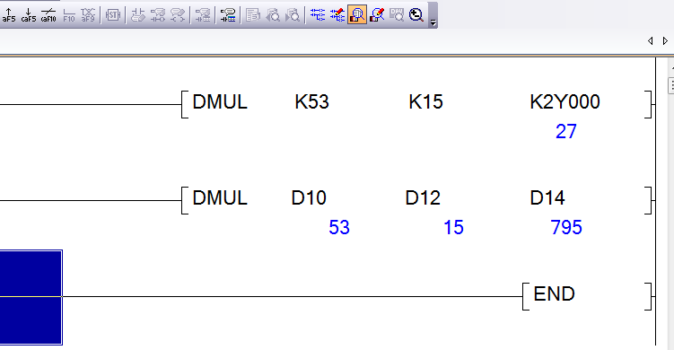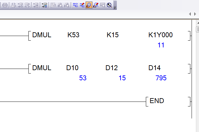 三菱MUL指令,MUL K53   K15   K1Y00 (K2Y00)如附圖 K1Y000,當(dāng)M0接通時得11的數(shù)值,轉(zhuǎn)換二進制1011 Y0Y1Y3輸出,如修改(K2Y000)得數(shù)值27,轉(zhuǎn)換二進制11011 Y0Y1 Y3Y4輸出 ,且更改 (K53 K15 K1)任意一個數(shù),都會改變輸出變化,問題是得數(shù)11與27如何計算得來。