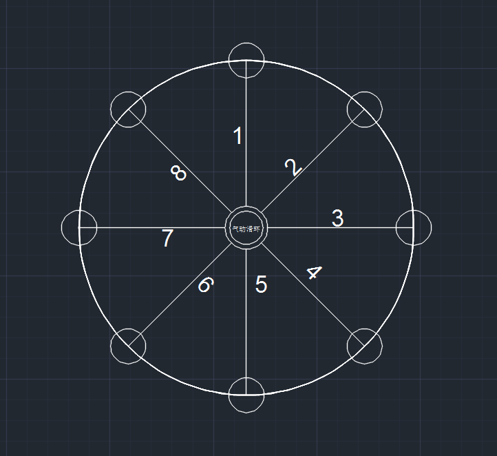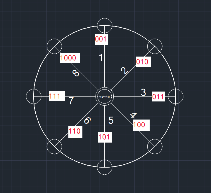 每個(gè)工位上卸料時(shí)要控制其對(duì)應(yīng)的氣管,比如第一次一號(hào)工站控制1號(hào)氣管,轉(zhuǎn)盤轉(zhuǎn)動(dòng)一次后,一號(hào)工站上料時(shí),需要控制8號(hào)氣管了,再轉(zhuǎn)一次,要控制7號(hào)氣管。其他工位類似這樣。