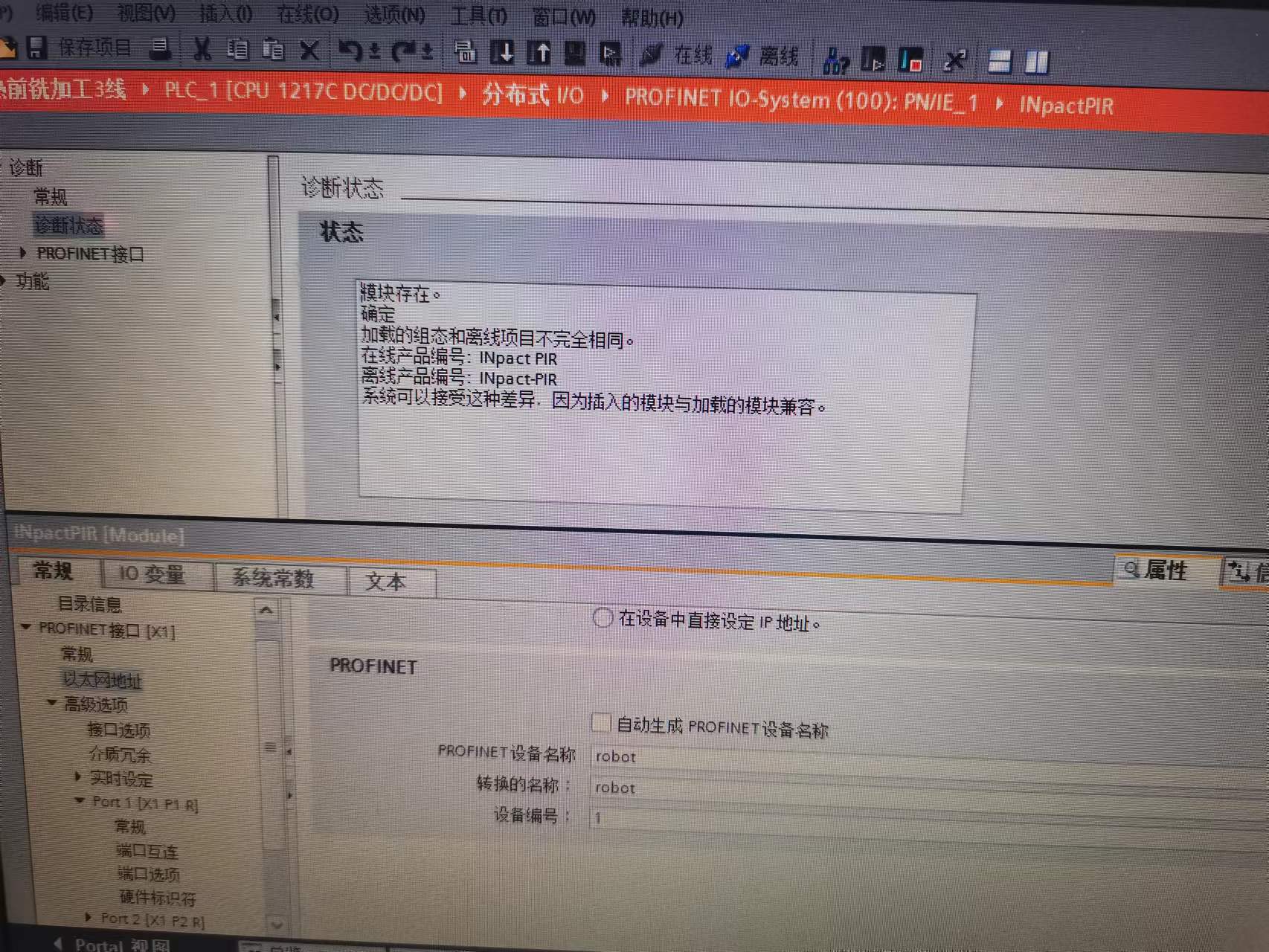 PLC與機(jī)器人io能正常通訊,但是就是PLC閃紅燈,博途在線診斷有個(gè)這樣的報(bào)錯(cuò):(模塊存在。確定加載的組態(tài)和離線項(xiàng)目不完全相同。在線產(chǎn)品編號(hào):INpactPIR離線產(chǎn)品編號(hào):INpact-PIR系統(tǒng)可以接受這種差異,因?yàn)椴迦氲哪K與加載的模塊兼容。)麻煩前輩們幫忙看一下
