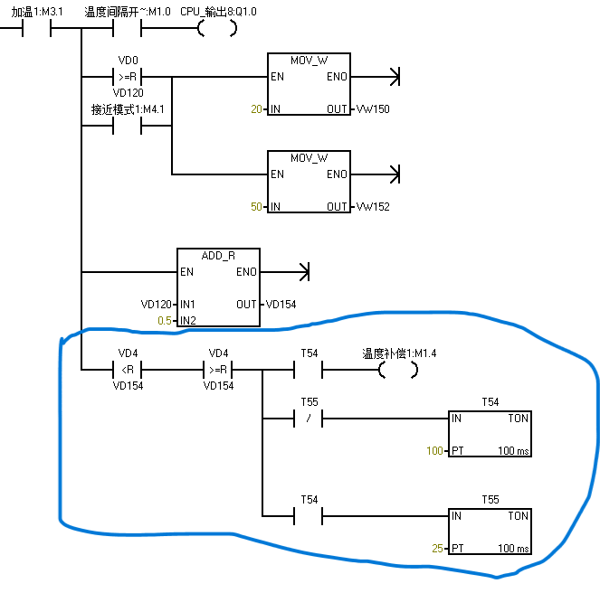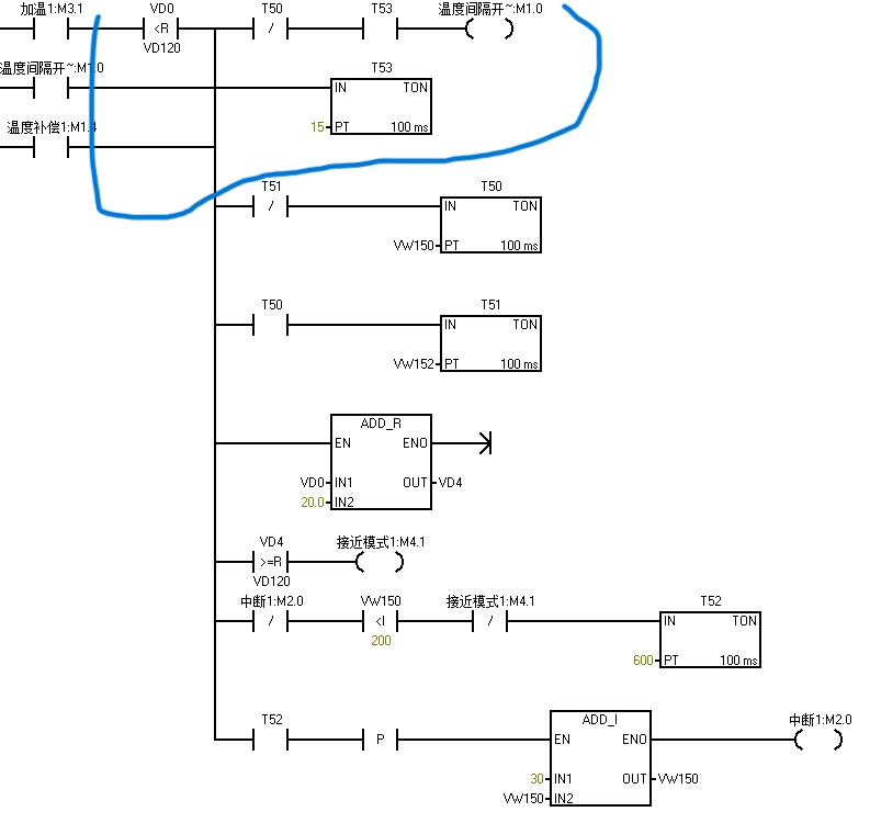 這個(gè)程序1中藍(lán)色圈的部分是先等T53時(shí)間到M1.0才能通是吧。