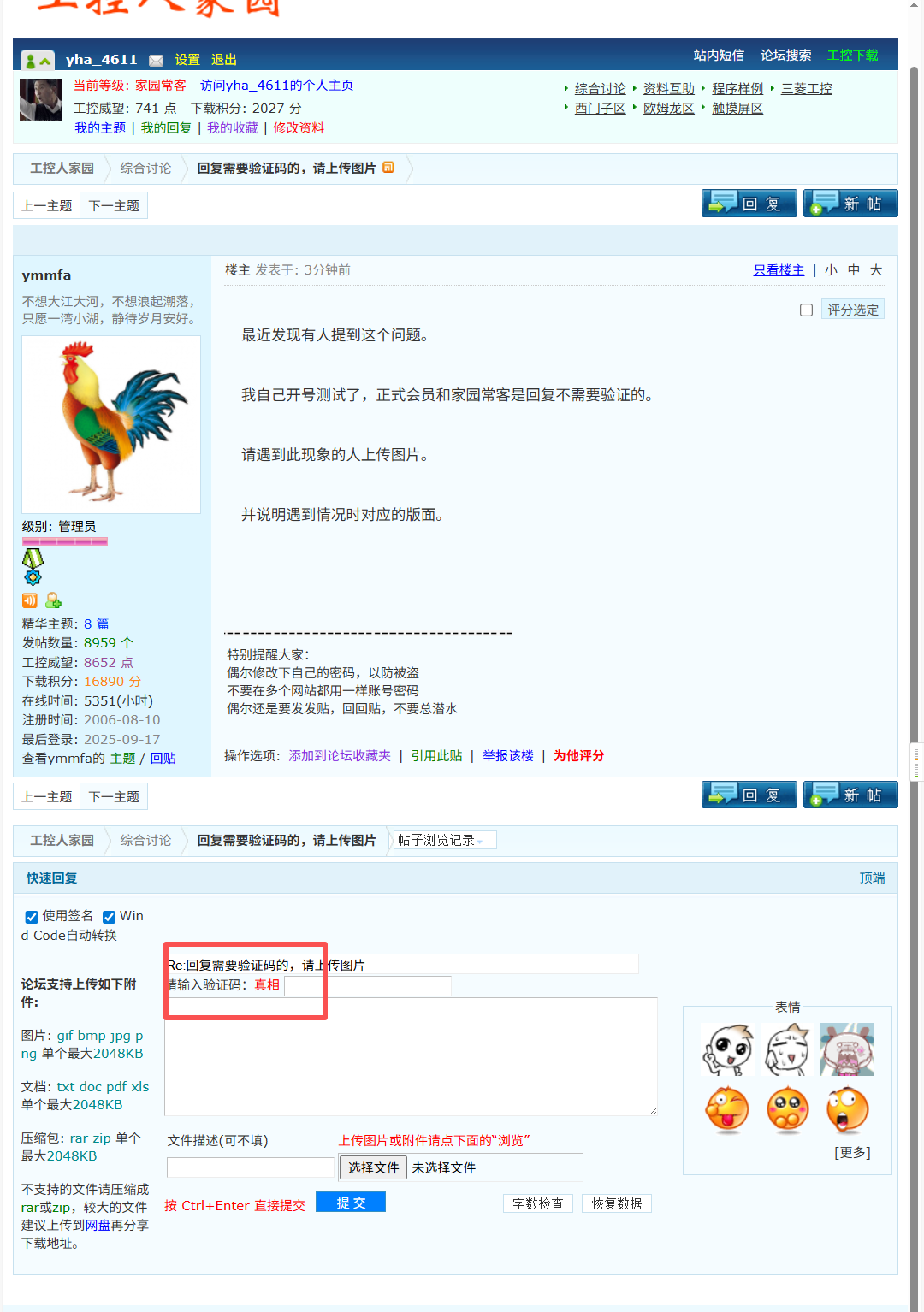 引用引用樓主ymmfa于2025-09-17 14:14發(fā)表的 回復(fù)需要驗證碼的,請上傳圖片 :最近發(fā)現(xiàn)有人提到這個問題。我自己開號測試了,正式會員和家園?褪腔貜(fù)不需要驗證的。請遇到此現(xiàn)象的人上傳圖片。.......