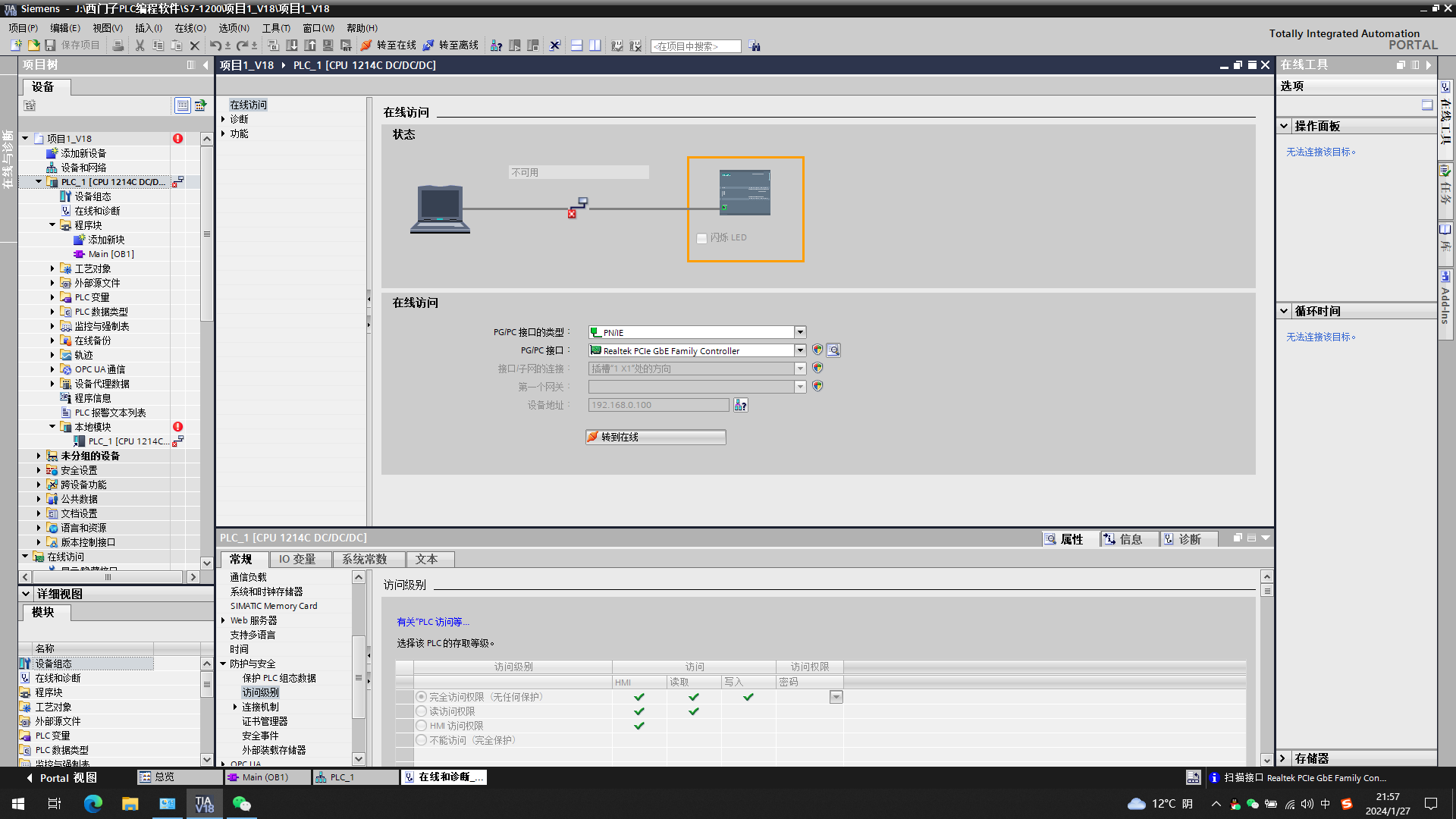引用引用第10樓菜鳥(niǎo)學(xué)工控_1于2024-01-29 08:30發(fā)表的 :我也遇到過(guò),好幾臺(tái)S7 1214C,固件版本4.5,其他的可以正常在線連接,其中1臺(tái)是和樓主一樣的情況,能PING通,但是博途不能在線,我是重啟電腦,又可以連接了,但是過(guò)一會(huì)又不能在線了;我的處理方法是全部重建編譯軟件和硬件,重啟電腦軟后在線PLC,格式化之前的程序,PLC斷電再重新下載完全編譯的程序,后面恢復(fù)正常了,每次都可以隨時(shí)在線 連接了;方法供樓主參考