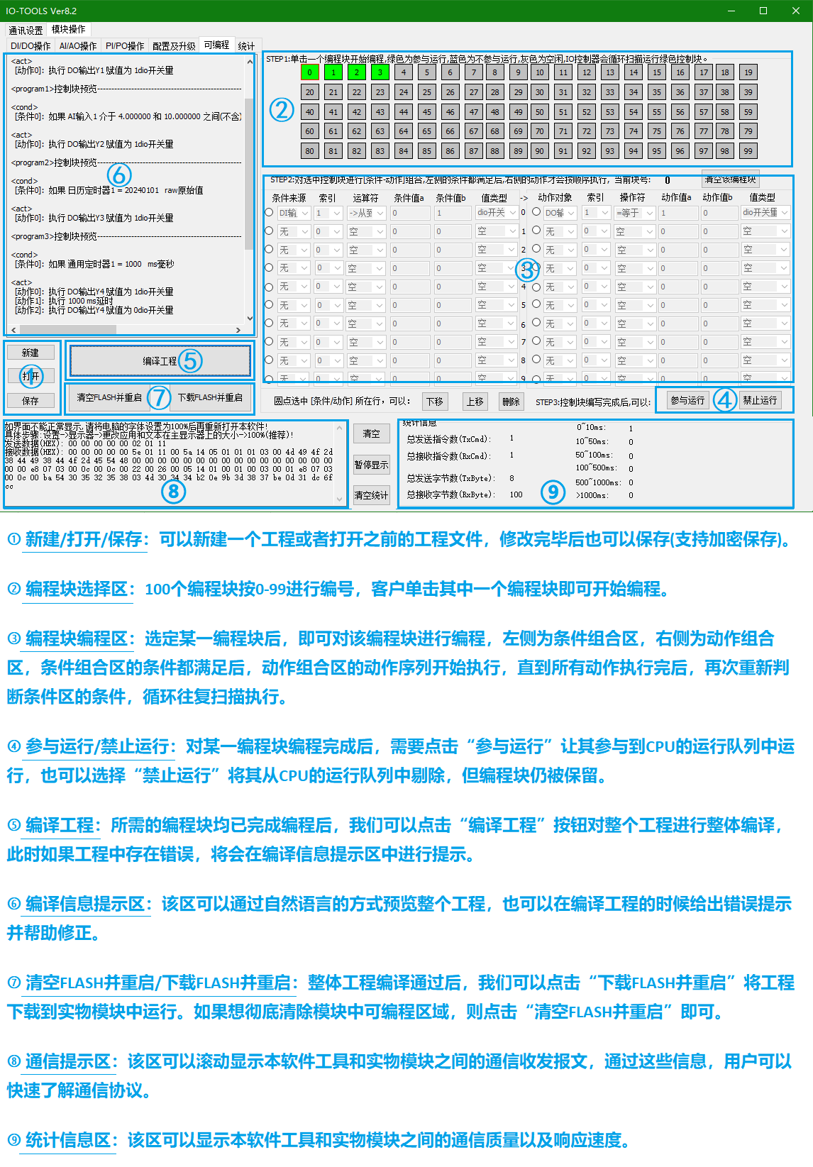 1.IO模塊編程不需要客戶撰寫代碼,也不需要客戶學(xué)習(xí)梯形圖或者ST,只需要基于PC端工具IO-TOOLS進(jìn)行“條件-動(dòng)作”的組合即可。