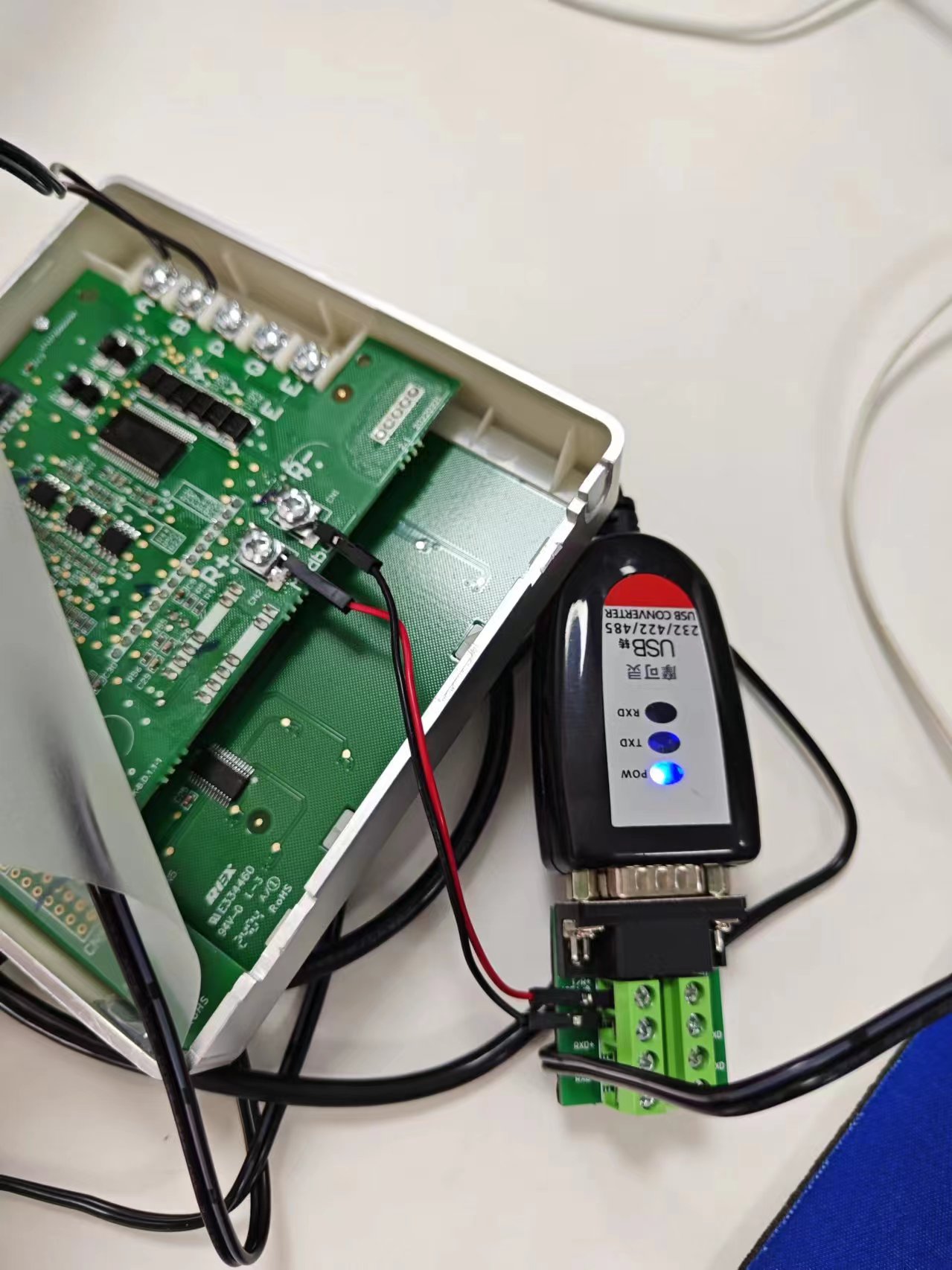 電腦用的胡桃Modbus調(diào)試工具,USB轉(zhuǎn)485線連接美的線控器。
