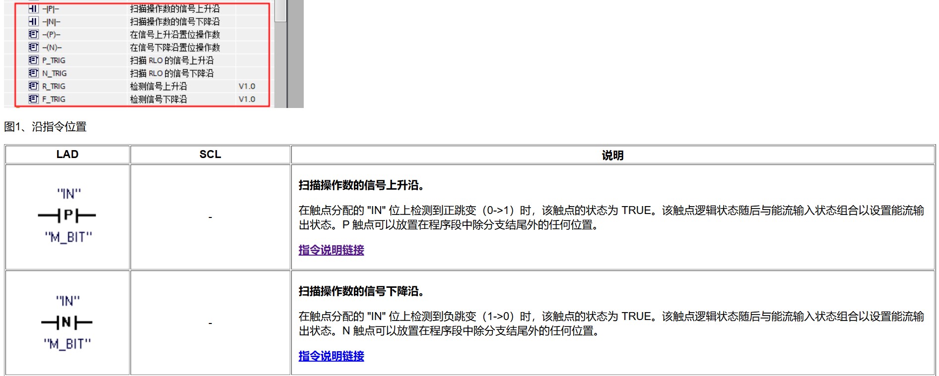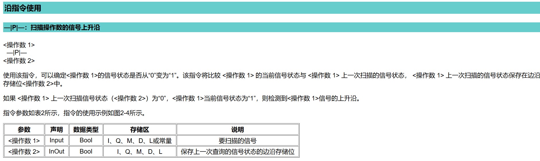 這是西門(mén)子的沿指令說(shuō)明。首先我們來(lái)看一下上升沿的概念:上一次掃描信號(hào)狀態(tài)(<操作數(shù) 2>)為“0”,<操作數(shù) 1>當(dāng)前信號(hào)狀態(tài)為“1”,則檢測(cè)到<操作數(shù) 1>信號(hào)的上升沿。