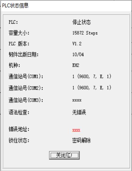 2、"PLC狀態(tài)信息"顯示:型號(hào)EH2,語(yǔ)法檢查無(wú)錯(cuò)誤,錯(cuò)誤地址XXXX,PLC停止,鎖住狀態(tài) 密碼解除;