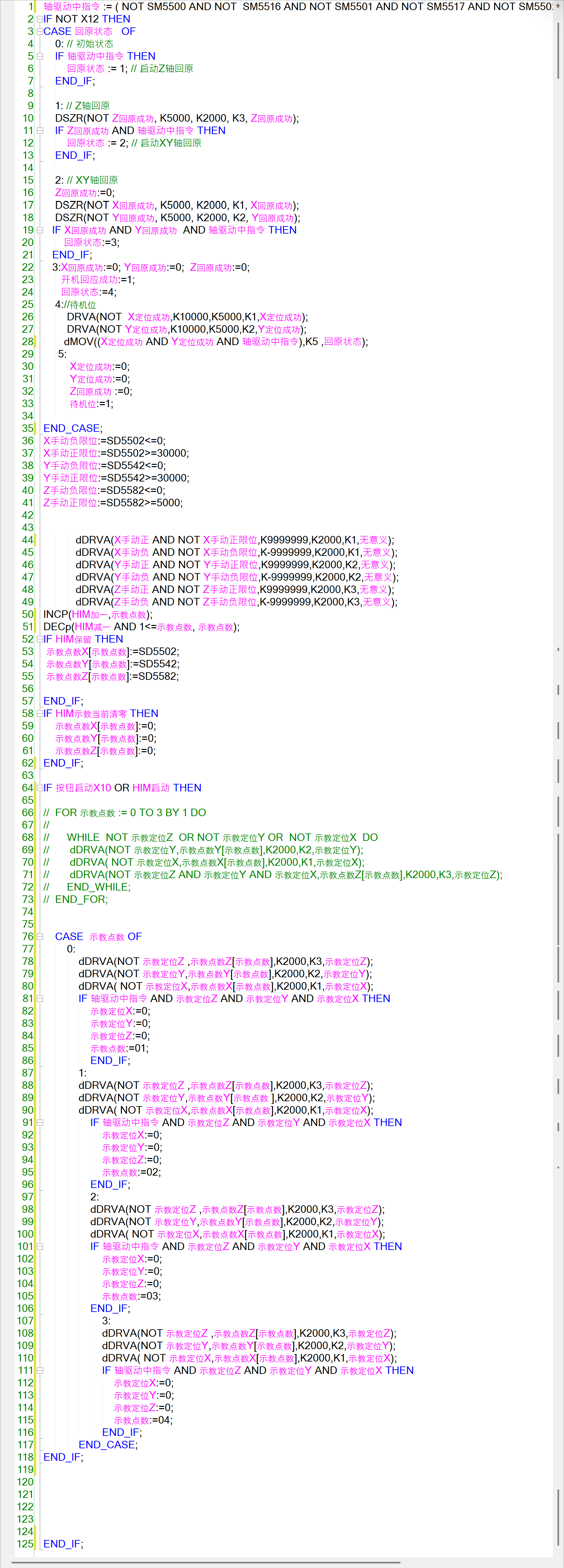 循環(huán)就是重復地執(zhí)行相同的指令,處理類似的數(shù)據(jù)(基址+變址),把你控制一個軸的思路重新整理一下,再規(guī)劃地址,確認好每個軸的不同數(shù)據(jù)地址之間的偏移,再用For循環(huán)去處理這些偏移即可。從簡單的練起,100個按鈕控制100個不同的燈=》100個按鈕分別按3秒控制100個不同的燈=》100個按鈕,按不同的時間(可配置,地址為D0,D1,D2,D3...或D0,D10,D20,D30...或D0,D100,D200,D300...時,不同地址偏移,循環(huán)要怎么改),控制100個不同的燈,理解了這個,再去寫個這個軸控的,當然,軸控有些還看時序