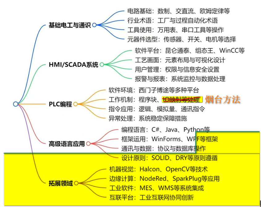我為什么會想到這一點(diǎn),以及為什么會想到這個話題,是因?yàn)槲铱吹搅艘粡垐D,一張工控行業(yè)需要掌握的技能的思維導(dǎo)圖: