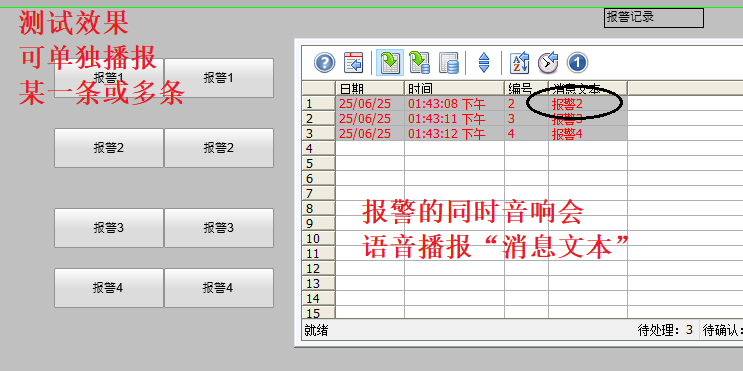 因?yàn)槭忻嫔弦呀?jīng)有前輩開發(fā)出了語(yǔ)音報(bào)警,但是不能靈活單獨(dú)的應(yīng)用到每一條報(bào)警上面。比如我只想要一條或者兩條重要信息實(shí)現(xiàn)語(yǔ)音播報(bào),其它報(bào)警靜默顯示就行。那么通過(guò)本例可輕松解決。