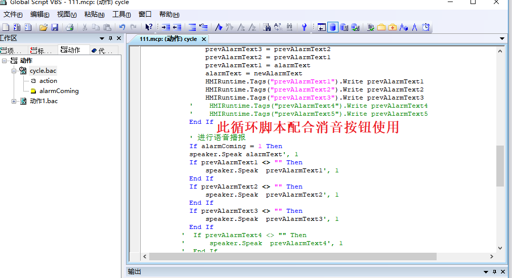 將剛才第二步的Voice替換成cycle腳本(注意一定要替換,不可以都保留),然后在報(bào)警控件中將事件里面的OnToolbarButtonClicked屬性加上記事本中的c腳本用于取消循環(huán),也可以自己外加按鈕來(lái)實(shí)現(xiàn)。