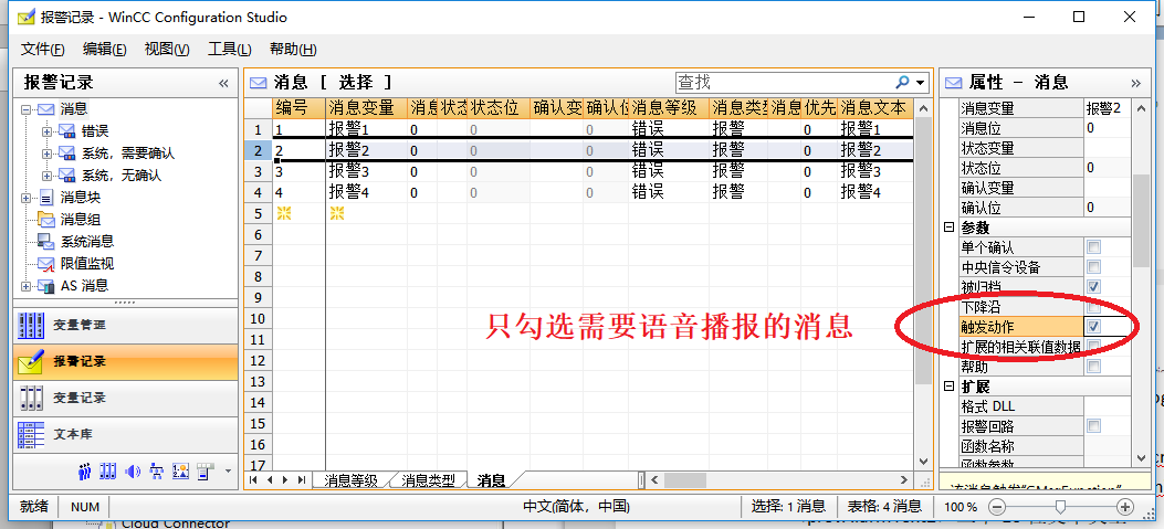 第五步,打開報(bào)警記錄找到想要播報(bào)的變量勾選屬性里面觸發(fā)動(dòng)作如圖(不勾選的變量不會(huì)播報(bào))。