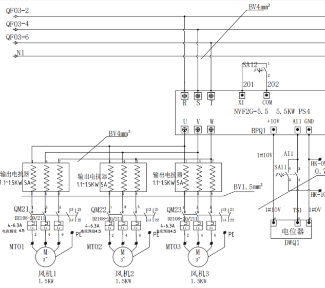 一臺5.5KW變頻器 帶3臺1.5KW 電動機(jī)【風(fēng)機(jī)負(fù)載】,要求是同開同關(guān),用0-10V調(diào)速,變頻器到電動機(jī)之間90m,加了電抗器。