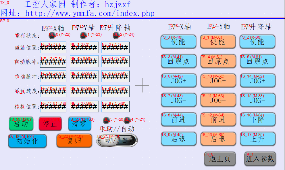 分享一個(gè)原創(chuàng)三菱三軸運(yùn)動(dòng)控制項(xiàng)目 這個(gè)是我通過查找 資料視頻 結(jié)合而來 我全網(wǎng)查找了很多觸摸屏 感覺不夠大氣, 大氣的觸摸屏又機(jī)型對(duì)不上 于是就自己花時(shí)間 搞了一個(gè)模板 觸摸屏品牌威綸通 型號(hào)TK6071IP。 程序是三菱FX3U 主要是我只有這個(gè)觸摸屏+plc+圖紙 。 我只寫了手動(dòng)程序。自動(dòng)就由大家一起完成。 第一次做比較亂 不是很好。望前輩們多指導(dǎo) !小輩在此感激不盡。!