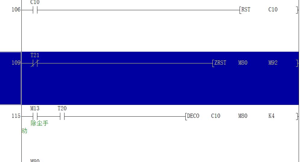 批次復(fù)位指令 T21如為ON則M80到M92十三個(gè)繼電器全部復(fù)位