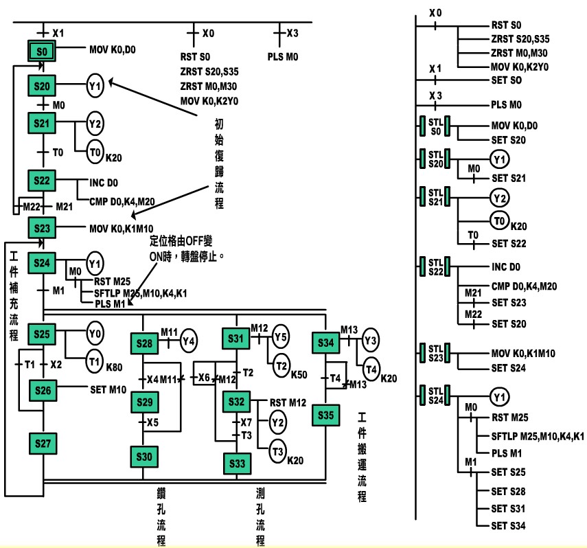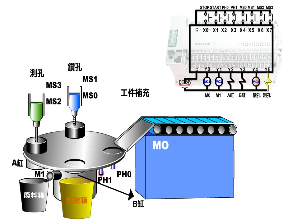 m1 OFF, 放工件A, ON則不放;放A后m1 ON;