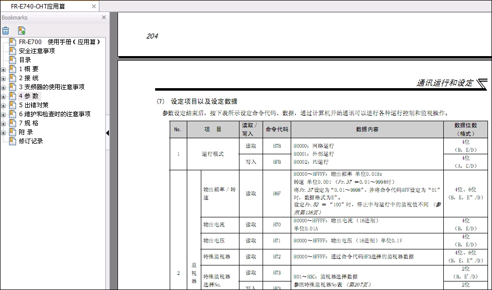 根據(jù)樓上的斑主,我下了個(gè)FR-E700的PDF看看 就在第4章 參數(shù)里面有205頁