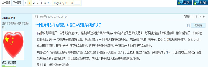中國南方有個(gè)鄉(xiāng)鎮(zhèn)企業(yè)也買了同樣的生產(chǎn)線,老板發(fā)現(xiàn)這個(gè)問題后大為發(fā)火,找了個(gè)小工來說:你他媽給老子把這個(gè)搞定,不然你給老子爬~。小工很快想出了辦法:他在生產(chǎn)線旁邊放了臺(tái)風(fēng)扇猛吹,空皂盒自然會(huì)被吹走。
