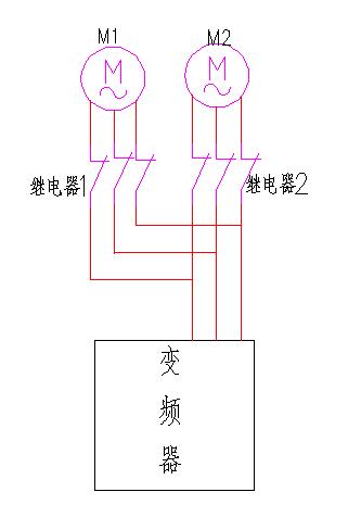 變頻器上應(yīng)該有參數(shù)可以設(shè)定第二臺(tái)電機(jī),同時(shí)通過變頻器的輸出端子來進(jìn)行電機(jī)的切換,富士變頻器可以參照其手冊說明(其第二套電機(jī)參數(shù)為A參數(shù),通過E20~E24參數(shù)設(shè)置輸出端子功能。)