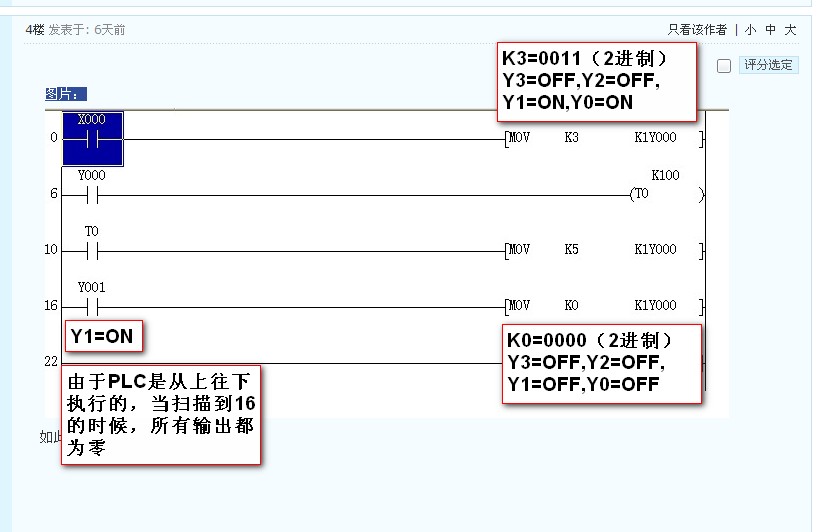 在用戶程序執(zhí)行階段,PLC總是按由上而下的順序依次地掃描用戶程序(梯形圖)。在掃描每一條梯形圖時,又總是先掃描梯形圖左邊的由各觸點構成的控制線路,并按先左后右、先上后下的順序?qū)τ捎|點構成的控制線路進行邏輯運算,然后根據(jù)邏輯運算的結果,刷新該邏輯線圈在系統(tǒng)RAM存儲區(qū)中對應位的狀態(tài);或者刷新該輸出線圈在I/O映象區(qū)中對應位的狀態(tài);或者確定是否要執(zhí)行該梯形圖所規(guī)定的特殊功能指令。即,在用戶程序執(zhí)行過程中,只有輸入點在I/O映象區(qū)內(nèi)的狀態(tài)和數(shù)據(jù)不會發(fā)生變化,而其他輸出點和軟設備在I/O映象區(qū)或系統(tǒng)RAM存儲區(qū)內(nèi)的狀態(tài)和數(shù)據(jù)都有可能發(fā)生變化,而且排在上面的梯形圖,其程序執(zhí)行結果會對排在下面的凡是用到這些線圈或數(shù)據(jù)的梯形圖起作用;相反,排在下面的梯形圖,其被刷新的邏輯線圈的狀態(tài)或數(shù)據(jù)只能到下一個掃描周期才能對排在其上面的程序起作用。