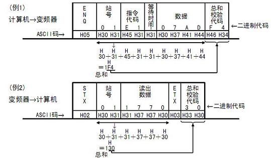 其中計算機到變頻器的數(shù)據(jù)跟本例中差不多,都是12位。那么,將例子中的數(shù)據(jù)轉(zhuǎn)為ASCII碼再看看:
