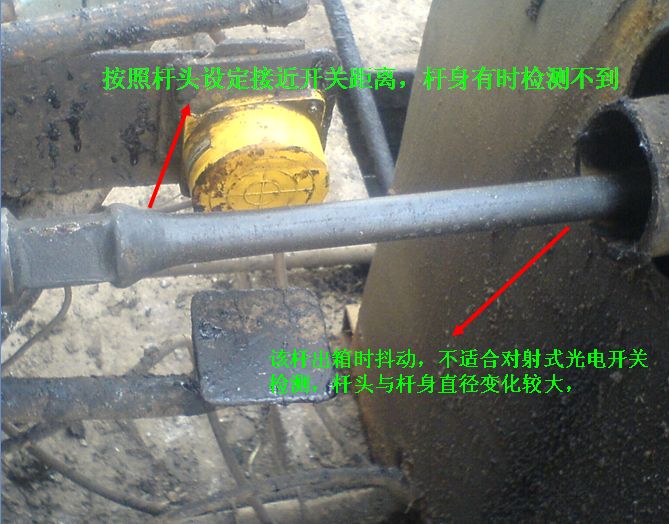 該工序是檢測出料的,使用圓盤式接近開關(guān)設(shè)定桿頭后桿身有時(shí)候漏檢,使用對射式檢測開關(guān)因桿件抖動而漏檢,特希望朋友們的幫助,謝謝。!