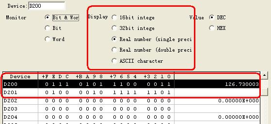 可以在軟件的【ONLINE】--【MONITOR】--【DEVICE BATCH】中切換數(shù)值顯示格式,來查看對應(yīng)的值。