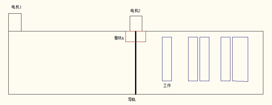 電機1一直轉(zhuǎn),帶動工件運轉(zhuǎn),當工件運行到導軌底下時電機1停止,電機2啟動,帶到滑塊A沿導軌運行到另一端立即再回到原點,然后電機1再啟動,直到下一工件到導軌底下,如此循環(huán)。
