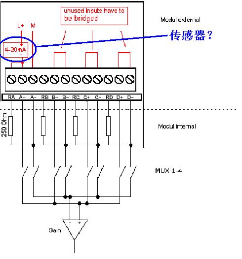 例如對于二線制傳感器,我要接線的話,就是將+24V的直流電接道傳感器的正(+)上,再將負(-)接回模擬量模塊的A+上,A+與RA短接,A-接直流電的0V,這樣就可以讀出數(shù)值來了?