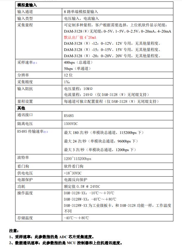 DAM-3128 和 DAM-3128W 為 8 路單端模擬量輸入,12 位 AD,RS485 通訊接口,帶有標(biāo)準(zhǔn) ModbusRTU
