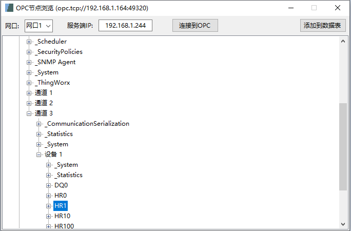 數(shù)據(jù)標(biāo)簽可手動輸入添加,也可以通過CSV文件導(dǎo)入導(dǎo)出,參數(shù)設(shè)置軟件(在附件中)的‘文件’菜單內(nèi)有相關(guān)功能按鈕;還可以通過‘編輯’->‘OPC節(jié)點(diǎn)瀏覽’瀏覽標(biāo)簽后,點(diǎn)右上角的‘添加到數(shù)據(jù)表’,如下圖: