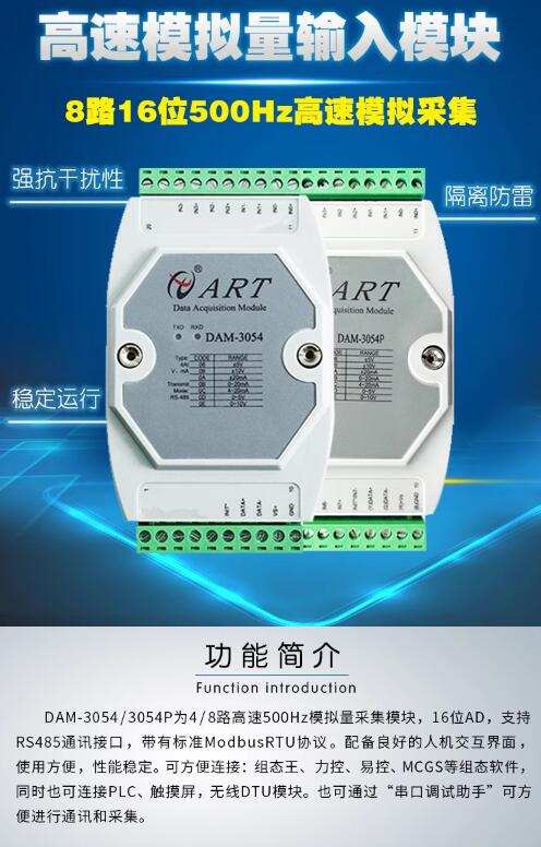 DAM-3054P為8路差分模擬量采集模塊,高速采集,16位AD,支持RS485通訊接口,帶有標(biāo)準(zhǔn)ModbusRTU協(xié)議。配備良好的人機(jī)交互界面,使用方便,性能穩(wěn)定。 北京阿爾泰科技發(fā)展有限公司是一家專(zhuān)業(yè)從事測(cè)控產(chǎn)品研發(fā)、生產(chǎn)、銷(xiāo)售和服務(wù)的公司。自主研發(fā)的產(chǎn)品包括多種總線(xiàn)數(shù)據(jù)采集板卡、分布式采集模塊、無(wú)線(xiàn)通訊數(shù)傳采集模塊、運(yùn)動(dòng)控制卡、測(cè)控機(jī)箱及測(cè)控系統(tǒng)、控制器、無(wú)風(fēng)扇工業(yè)電腦、工業(yè)平板電腦、工業(yè)主板等 。