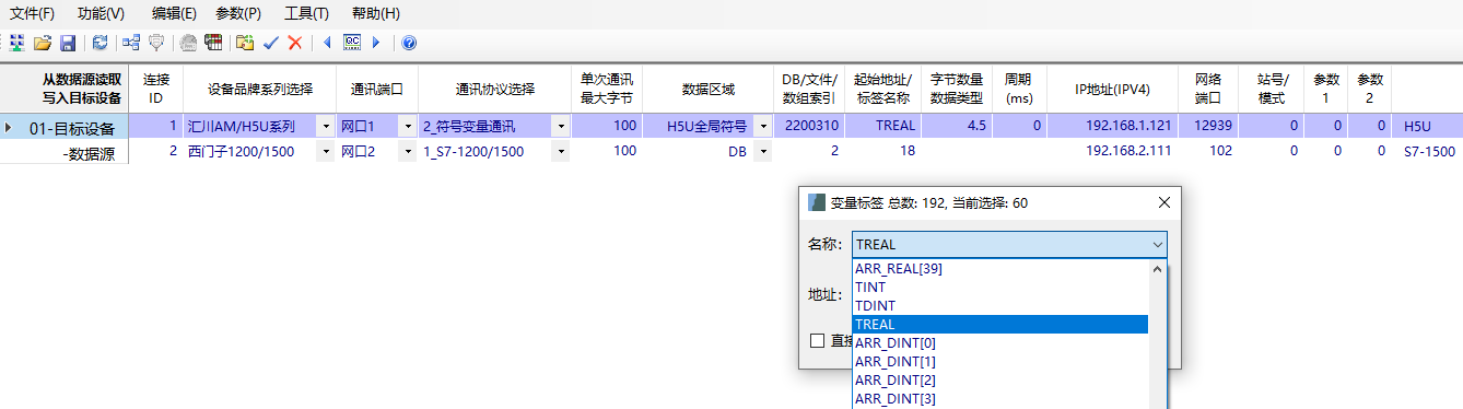1. 讀取西門子PLC的DB2.DBD18的REAL類型的數(shù)據(jù),寫入到匯川PLC的'TREAL'標簽,4個字節(jié);