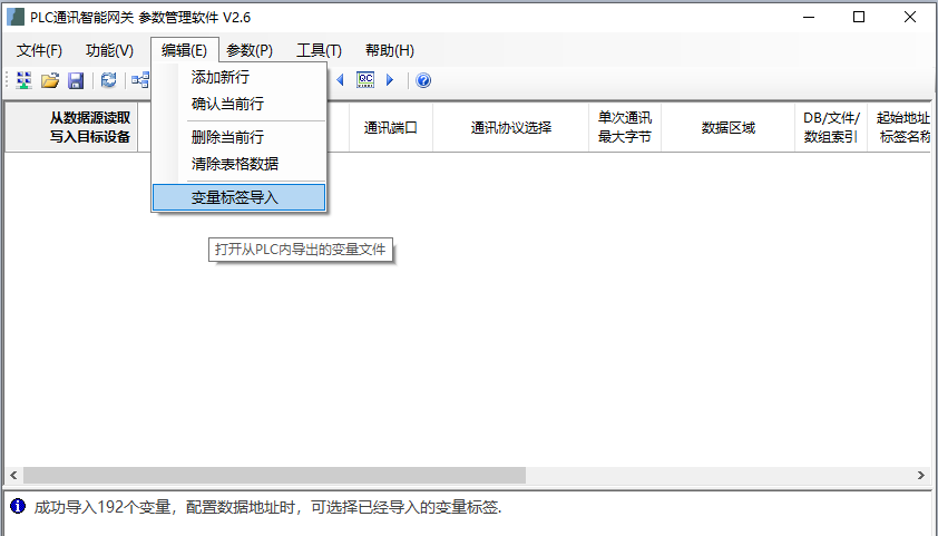 本案例采用西門子1200的PLC跟匯川H5U的全局變量標簽方式通訊,通過智能網(wǎng)關的參數(shù)軟件(在附件中)選擇PLC之間通訊的功能,通過(編輯->變量標簽導入)加載從H5U的PLC內(nèi)導出的HMI監(jiān)控變量表,如下圖,導入成功后在狀態(tài)消息欄有提示: