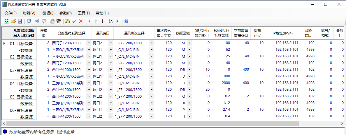 IGT-DSER是從數(shù)據(jù)源讀取數(shù)據(jù)后寫入到目標(biāo)設(shè)備, 通過改變數(shù)據(jù)源和目標(biāo)設(shè)備對應(yīng)不同的行實現(xiàn)PLC之間雙向通訊。通過參數(shù)配置軟件(在附件中)根據(jù)PLC通訊地址,寄存器數(shù)量等參照案例配置好相關(guān)參數(shù)后下載重啟(參數(shù)->參數(shù)寫入到網(wǎng)關(guān))、(工具->重啟網(wǎng)關(guān));通過網(wǎng)關(guān)的參數(shù)配置軟件讀取網(wǎng)關(guān)參數(shù)(參數(shù)->從網(wǎng)關(guān)讀取參數(shù))后,看軟件上顯示的狀態(tài)消息,根據(jù)狀態(tài)消息調(diào)試,正常是如下圖的狀態(tài)消息,(工具->網(wǎng)關(guān)數(shù)據(jù)監(jiān)控)可查看數(shù)據(jù)源的數(shù)據(jù)。