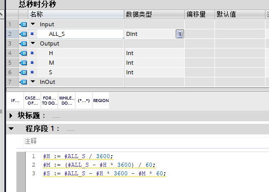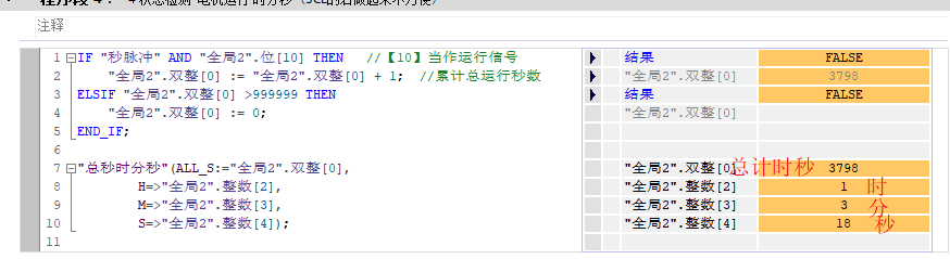 感謝粉絲網(wǎng)友的支持,也歡迎你們的討論和分享。昨天我們簡單討論了一下標(biāo)準(zhǔn)功能塊的重要性,僅僅是拿電機(jī)塊舉了一個(gè)例子,有粉絲問能否把電機(jī)運(yùn)行時(shí)間做到塊里面,完善一下功能呢?那是絕對(duì)當(dāng)然的100%可以的。。。本身這就是一個(gè)開放的非標(biāo)的功能,各位根據(jù)需要搞一搞即可。那順著網(wǎng)友的意思,隨便寫了一個(gè)功能單獨(dú)演示一下。沒有集成到昨天的FB中,如果需要集成,只需要復(fù)制后面這部分即可,記得補(bǔ)齊FB的管腳哦。它的原理非常簡單,用一個(gè)雙字類型數(shù)據(jù)來接收電機(jī)運(yùn)行的累計(jì)總秒數(shù)。然后稍加運(yùn)算把它拆分成時(shí)分秒顯示更直觀一些。最后注意加上自動(dòng)清零或者人工清零運(yùn)行時(shí)間,防止出現(xiàn)長時(shí)間的數(shù)據(jù)溢出錯(cuò)誤。還有啥更好的想法歡迎各位看官留言交流和分享。也虛心接受您的批評(píng)和指導(dǎo)。