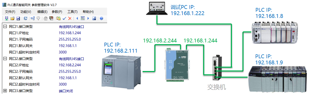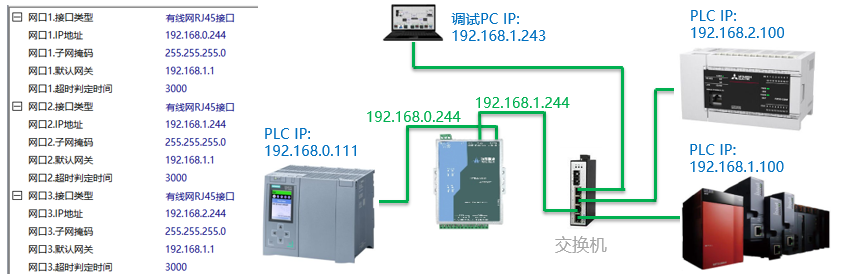 三、多網(wǎng)段的PLC之間通訊: IGT-DSER智能網(wǎng)關(guān)的兩個(gè)網(wǎng)口設(shè)置為不同的網(wǎng)段,同時(shí)開啟網(wǎng)口3設(shè)置為第三網(wǎng)段,該智能網(wǎng)關(guān)沒有實(shí)際的物理網(wǎng)口3,自動(dòng)將IP綁定到物理網(wǎng)口2,作為網(wǎng)口2的第二IP。