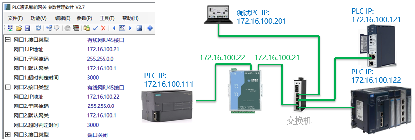 一、同網(wǎng)段的PLC之間通訊: IGT-DSER智能網(wǎng)關(guān)的兩個(gè)網(wǎng)口設(shè)置為同網(wǎng)段,每個(gè)網(wǎng)口是獨(dú)立的子網(wǎng)