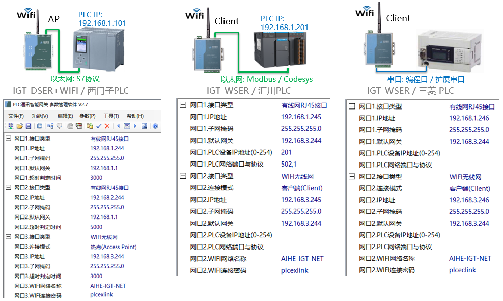 五、多臺(tái)PLC之間WIFI無線通訊:一臺(tái)IGT-DSER+WIFI智能網(wǎng)關(guān)做AP熱點(diǎn),兩臺(tái)IGT-WSER智能網(wǎng)關(guān)設(shè)置為客戶端。