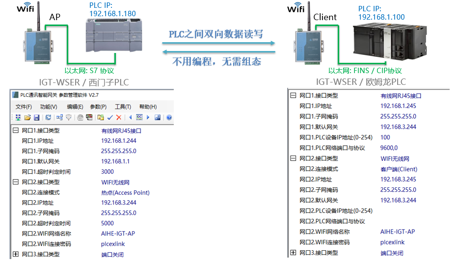 四、兩臺(tái)PLC之間WIFI無線通訊:兩臺(tái)IGT-WSER智能網(wǎng)關(guān),分別設(shè)置為WIFI-AP熱點(diǎn)、WIFI-Client客戶端。