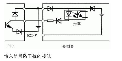 當(dāng)輸入開關(guān)信號(hào)進(jìn)入變頻器時(shí),有時(shí)會(huì)發(fā)生外部電源和變頻器控制電源(DC24V)之間的串?dāng)_。正確的連接是利用PLC電源,將外部晶體管的集電極經(jīng)過二極管接到PLC。如圖4所示。