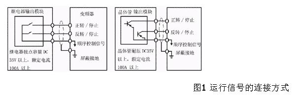 變頻器的輸入信號(hào)中包括對(duì)運(yùn)行/停止、正轉(zhuǎn)/反轉(zhuǎn)、微動(dòng)等運(yùn)行狀態(tài)進(jìn)行操作的開關(guān)型指令信號(hào)。變頻器通常利用繼電器接點(diǎn)或具有繼電器接點(diǎn)開關(guān)特性的元器件(如晶體管)與PLC)相連,得到運(yùn)行狀態(tài)指令,如圖1所示。