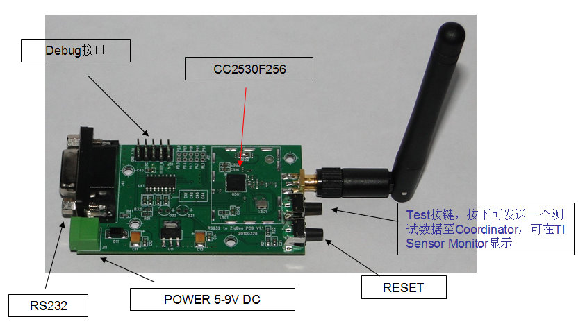 主芯片是TI CC2530F256,TI公司第二代ZigBee SOC芯片。