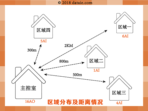 每個(gè)區(qū)域距離主控室的直線距離及傳輸信號(hào)路數(shù)如下圖所示 ▼