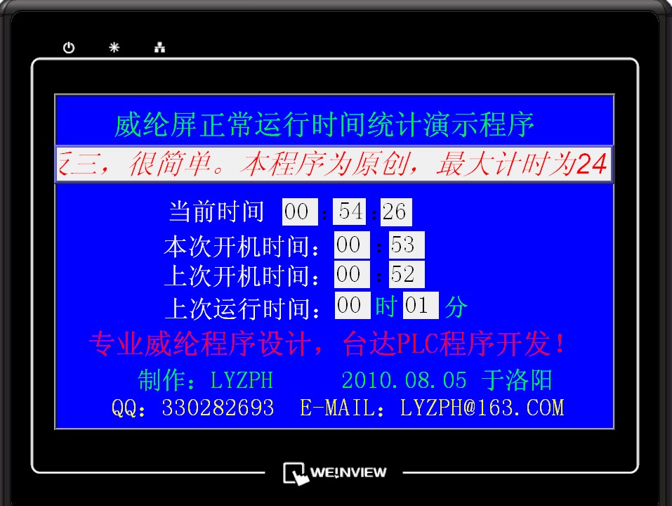 威綸mt800 6100IV的演示,本人原創(chuàng),使用宏指令設(shè)計的。從開機到斷電,再上電后,即可顯示出上次開機時間,上次運行了多長時間。因為是演示程序,秒級以下未處理,也限制了最大計時為24小時,超出會出錯。如果是工程,不會出現(xiàn)此現(xiàn)象。交流QQ:330282693