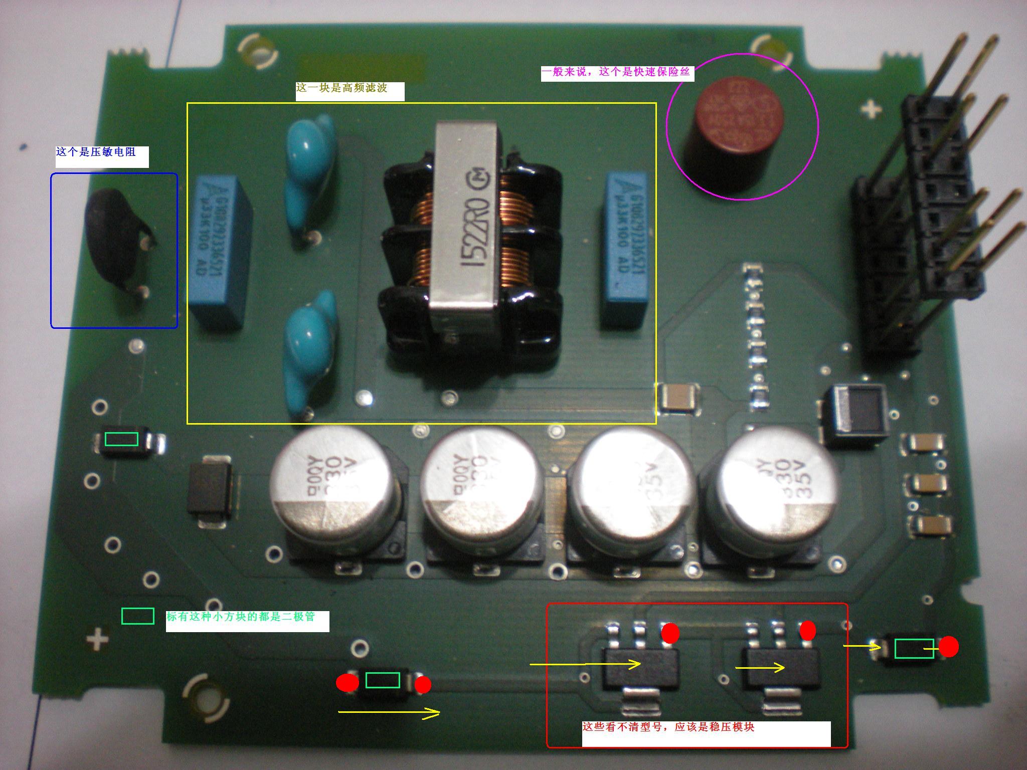 電壓測量我標(biāo)注在圖上了,凡是紅點(diǎn)的都應(yīng)該在+24V 左右,哪個(gè)點(diǎn)沒有,就是前級原件壞了,