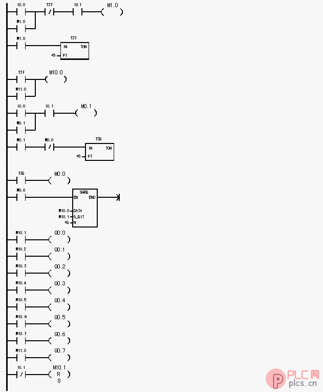 M10.0為數(shù)據(jù)輸入端DATA ,根據(jù)控制要求,每次只有一個輸出,因此只需要在第一個移位脈沖到來時由M10.0送入移位寄存器S-BIT位(M10.1)一個“1”