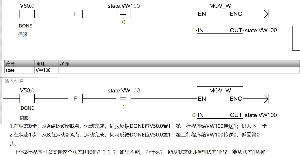 工藝要求是A點到B點之間來回運動, 狀態(tài)一開始為0,然后從A點運動到B點,利用伺服完成位DONE的上升沿將狀態(tài)變?yōu)?(vw100=1);